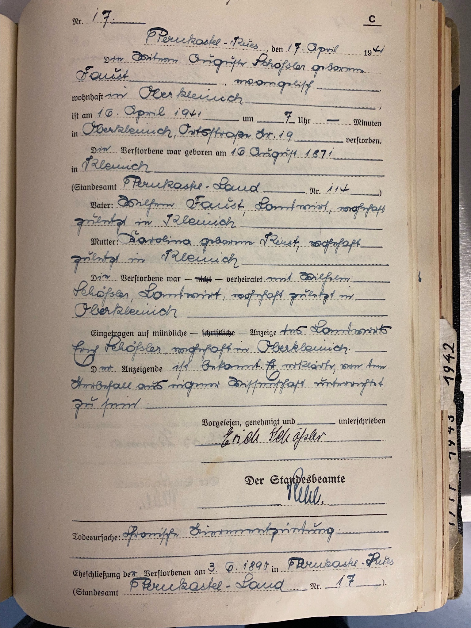 Mathilde Faust | * 16.08.1871 (Kleinich) | oo 31.01.1891 (Büchenbeuren) Peter Velten (VI) | t 03.04.1952 (Lautzenhausen) |