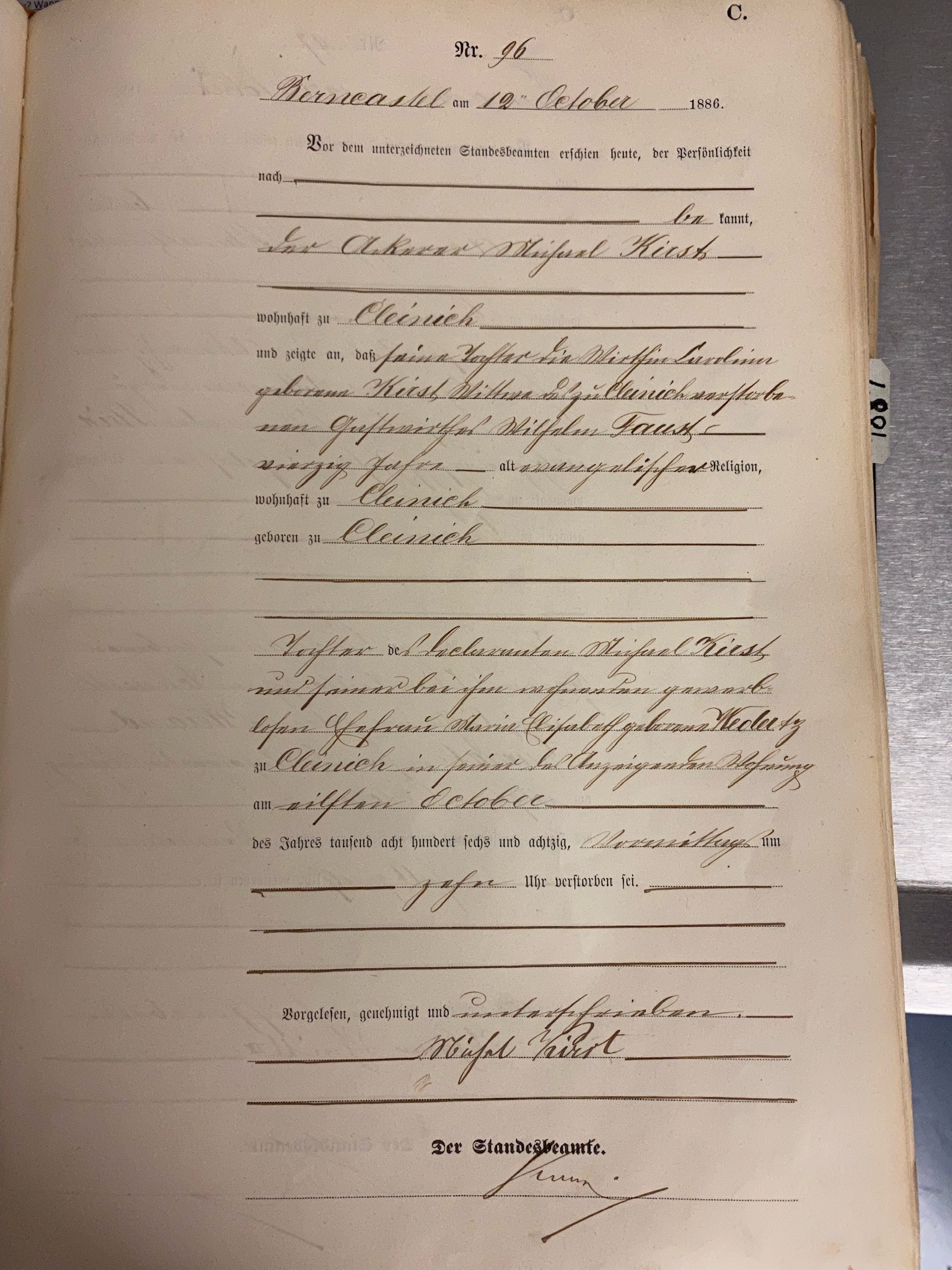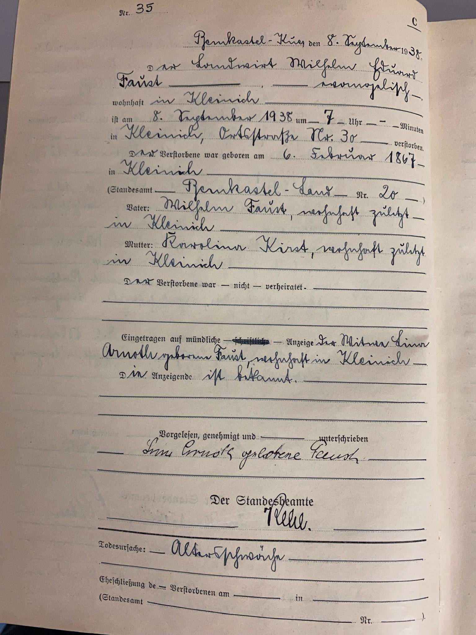 Wilhelm Faust | * 25.09.1837 (Oberkleinich) | oo 13.03.1863 (Bernkastel-Kues) Karoline Kirst | t 15.02.1886 (Oberkleinich) |