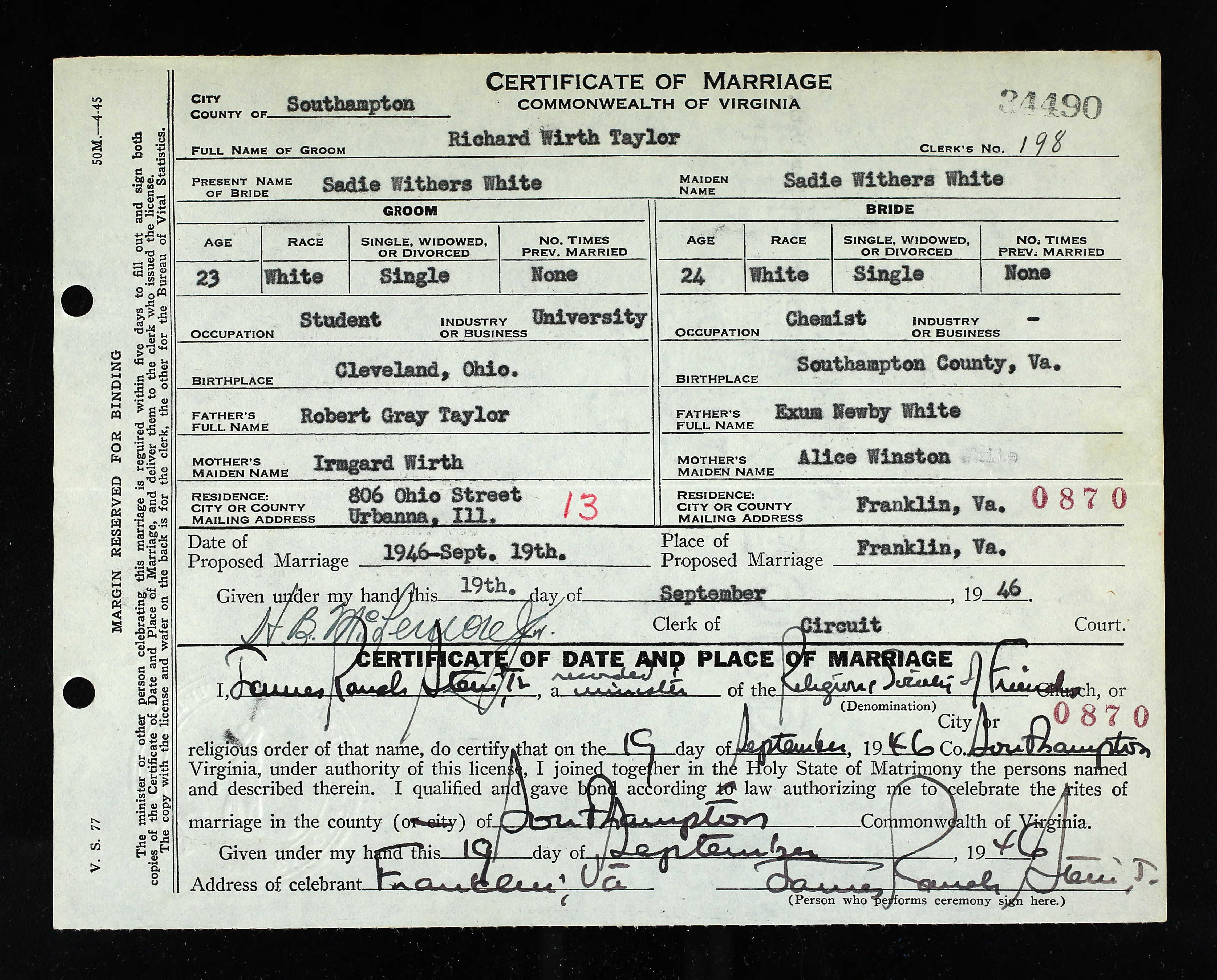 * 15.01.1923 (Cleveland,OH) | oo 19.09.1946 (Franklin, VA) Sadie Withers White | t 25.03.2000 (Henderson, NV) |