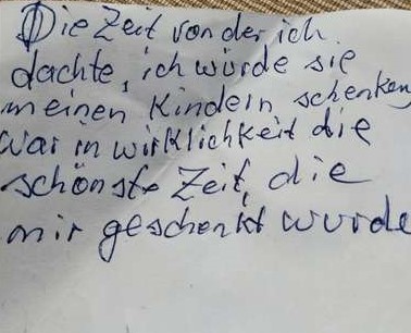 An diesen Menschen erinnerte nun eine Nutzerin in einer Amrum-Facebook-Gruppe. Sie berichtete von einer besonderen Begebenheit, „in Erinnerung an Herrn Boyens“. Dieser habe ihr im Juli seine Gedanken mit auf den Weg gegeben. Zu verifizieren ist dies zwar nicht, es deutet aber auch nichts auf einen Fake hin. Offensichtlich hinterließ er ihr handschriftlich auf der Rückseite ihres Strandkorb-Bons eine Weisheit. Oder aber sie hat diese selbst notiert, um sie nicht zu vergessen, und jetzt Monate später wiederentdeckt. Sie lautet: „Die Zeit, von der ich dachte, ich würde sie meinen Kindern schenken, war in Wirklichkeit die schönste Zeit, die mir geschenkt wurde.“