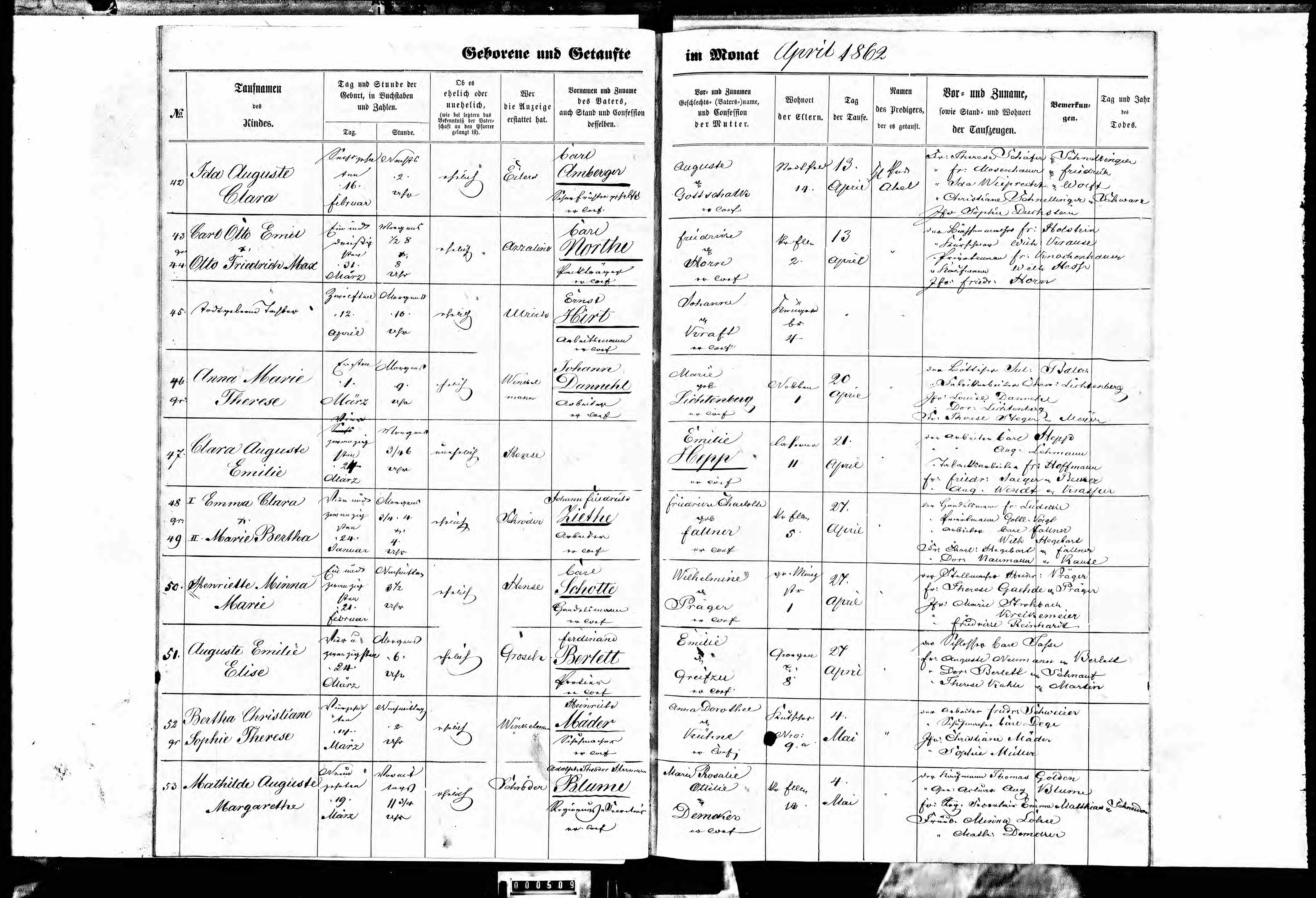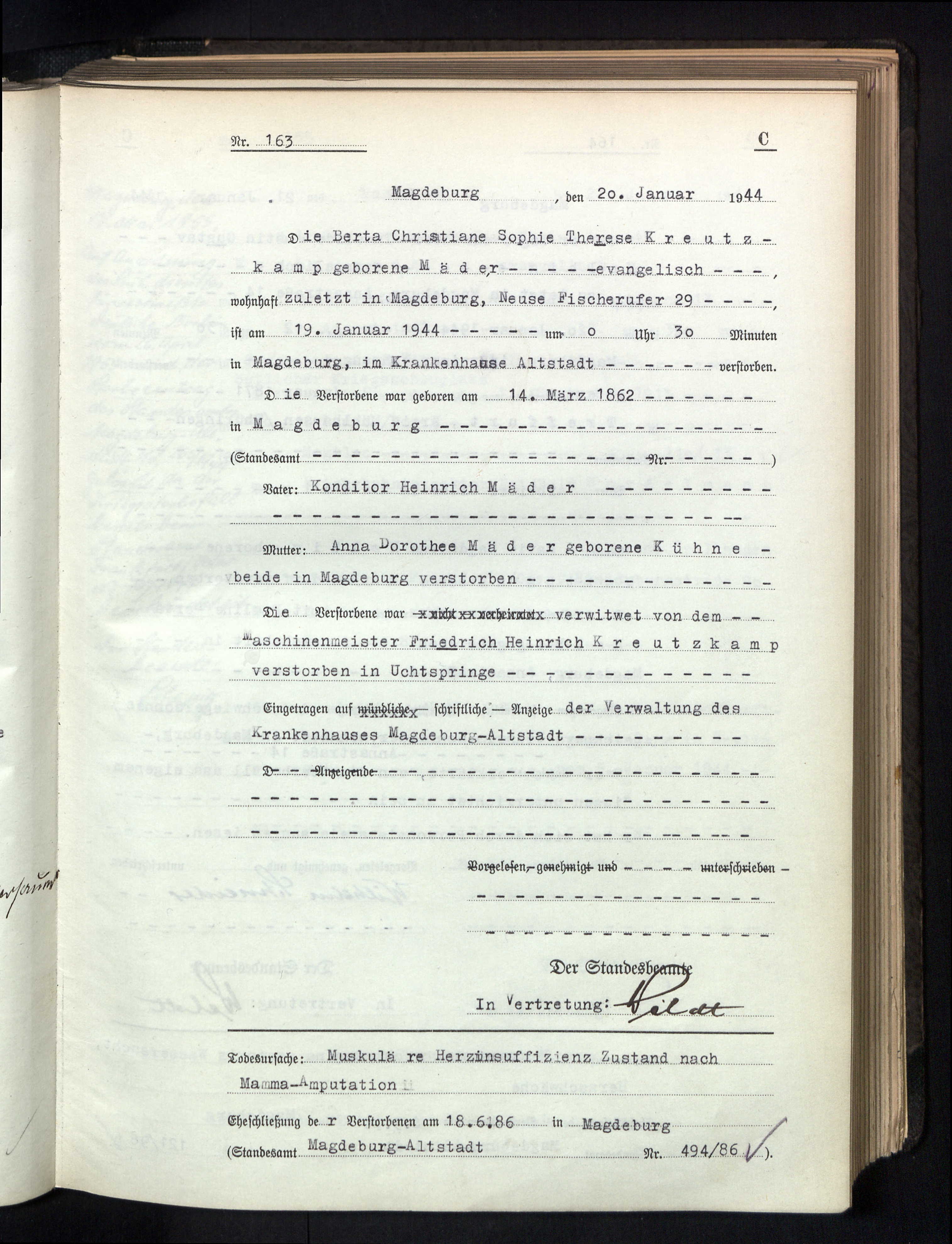 | Bertha Christiane Sophie Therese Mäder | * 14.03.1862 (Magdeburg-Altstadt) | oo 18.06.1886 (Magdeburg-Altstadt) Friedrich Heinrich Kreutzkamp | t 19.01.1944 (Magdeburg-Altstadt) |