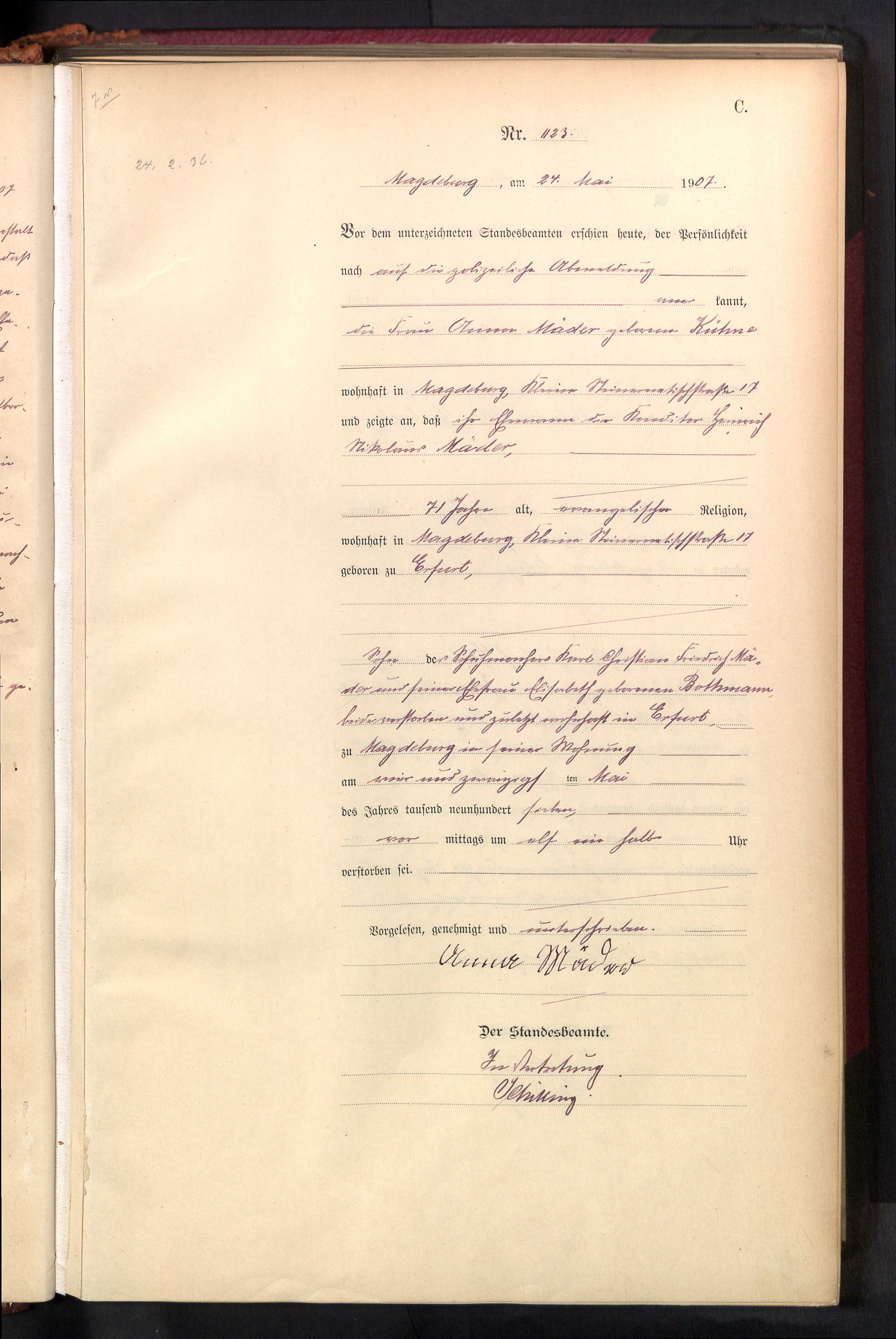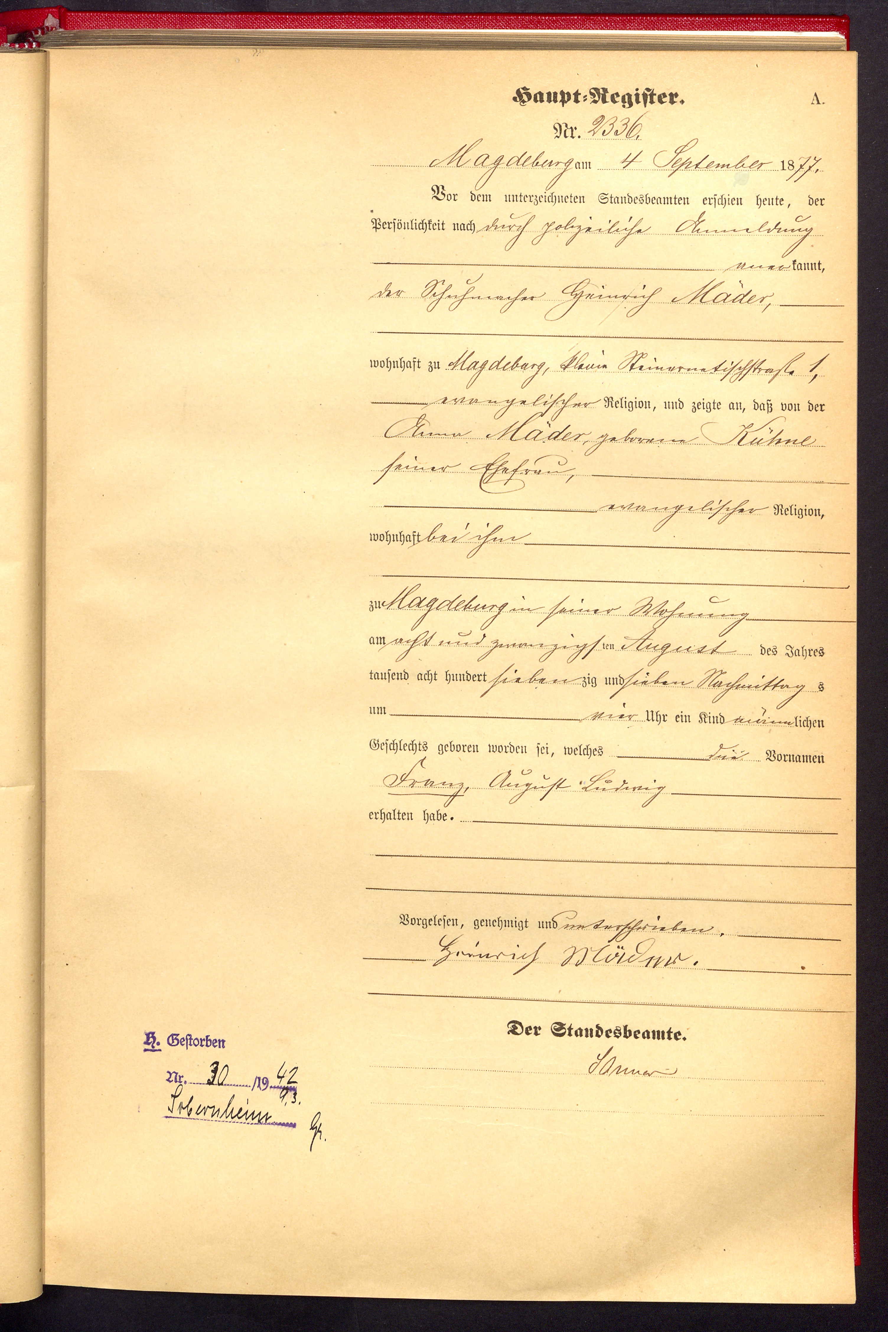 | Franz August Ludwig Mäder | * 28.08.1877 (Magdeburg-Altstadt) | oo xx.xx.nach 1897 Agnes Frieda Kaiser | t 09.03.1942 (Sobernheim) |