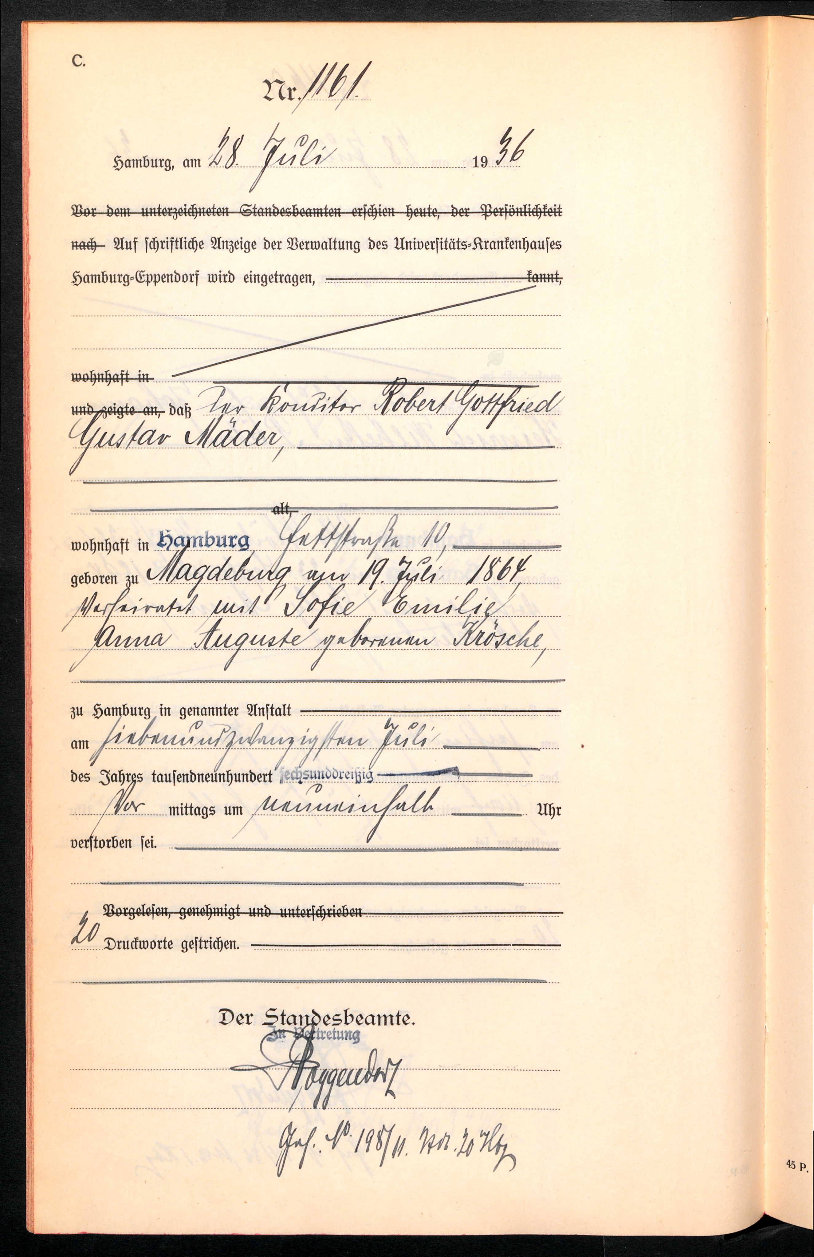 | Robert Gottfried Gustav Mäder | * 19.07.1864 (Magdeburg-Altstadt) | oo 01.04.1911 (Hamburg) Sofie Emilie Anna Auguste Krösche | t 27.07.1936 (Hamburg) |