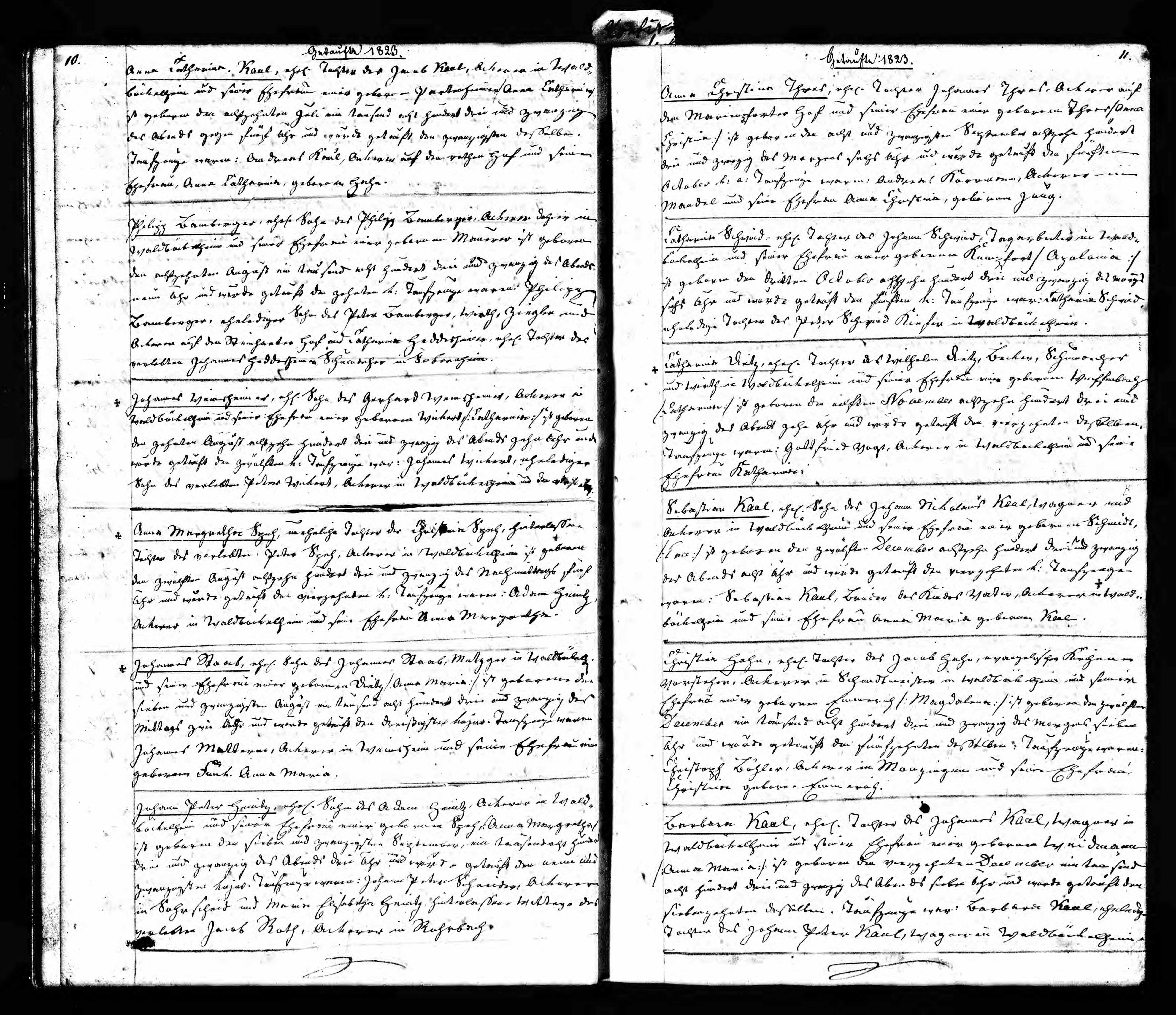 | Catharina Elisabeth Kaul | * 15./25.12.1811 (Waldböckelheim) | oo1 26.12.1833 (Waldböckelheim) Johann Hiltz, oo2 04.03.1834 (Waldböckelheim) Simon Schmitt | t xx.xx.xxxx |