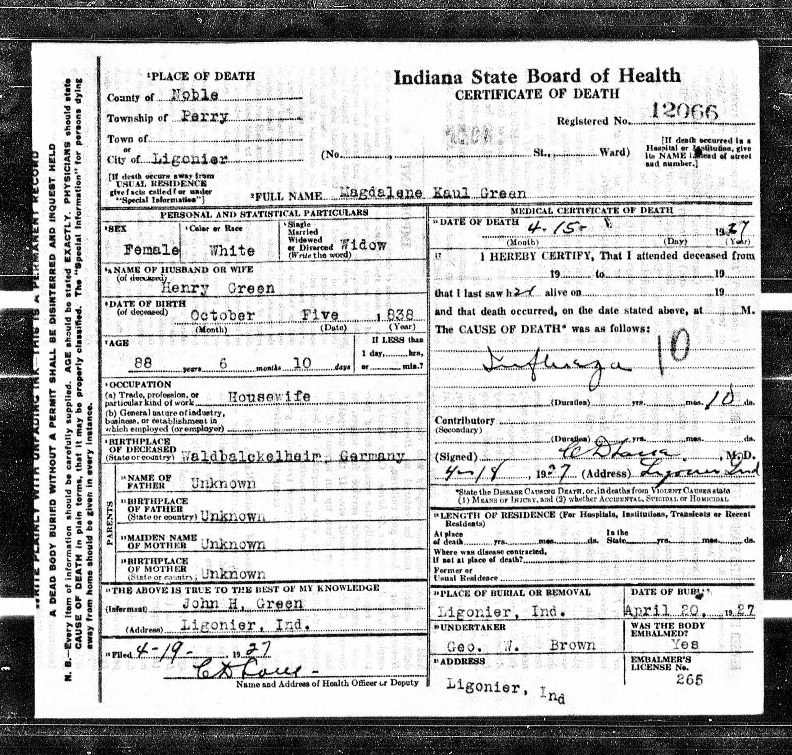 * 05.10.1838 (Waldböckelheim) | oo xx.xx.1861 (New Frankfort, MO) Henry Green | t 15.04.1927 (Ligonier, IN) |