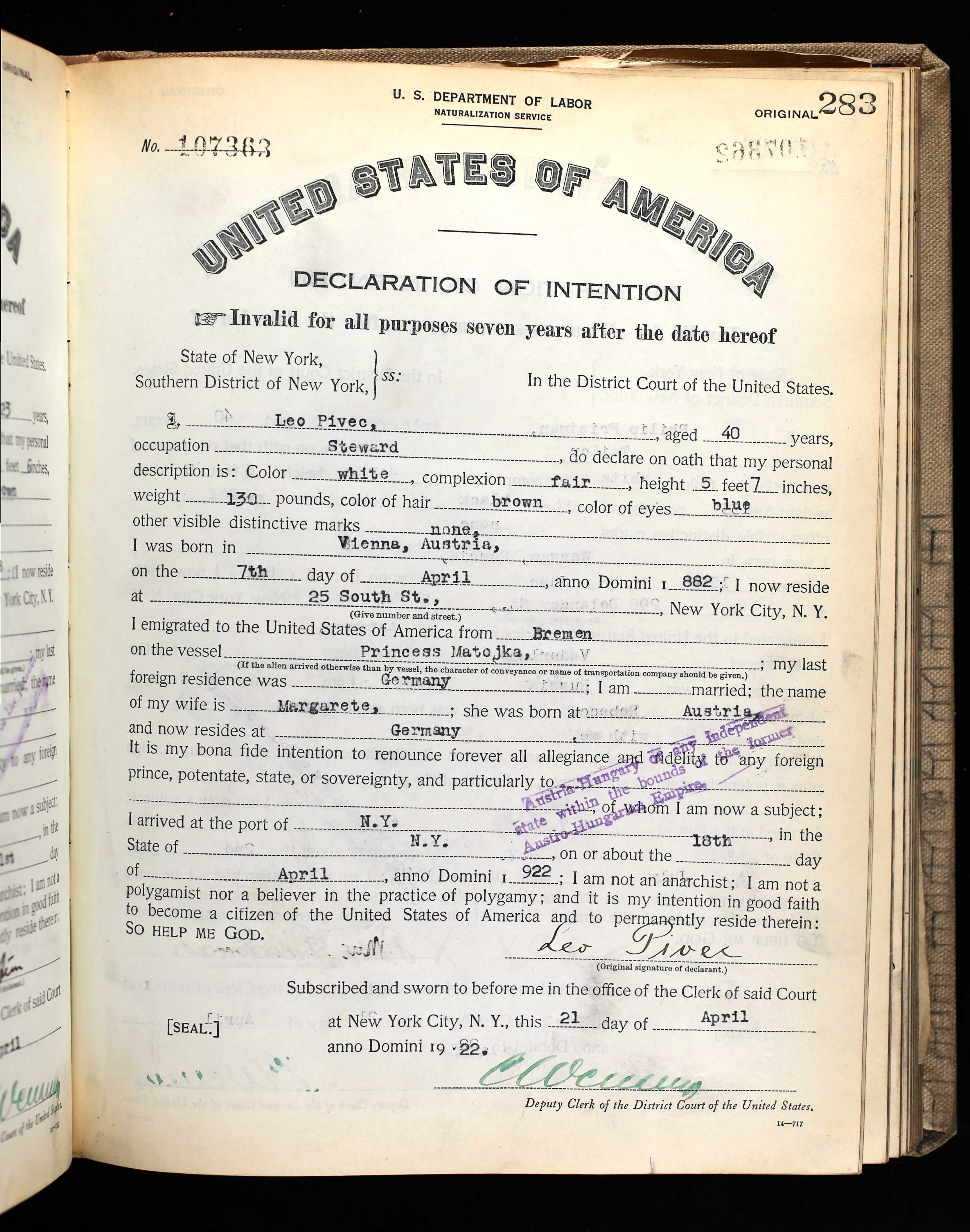 21.04.1922 Absichtserklärung Einbürgerung (USA)