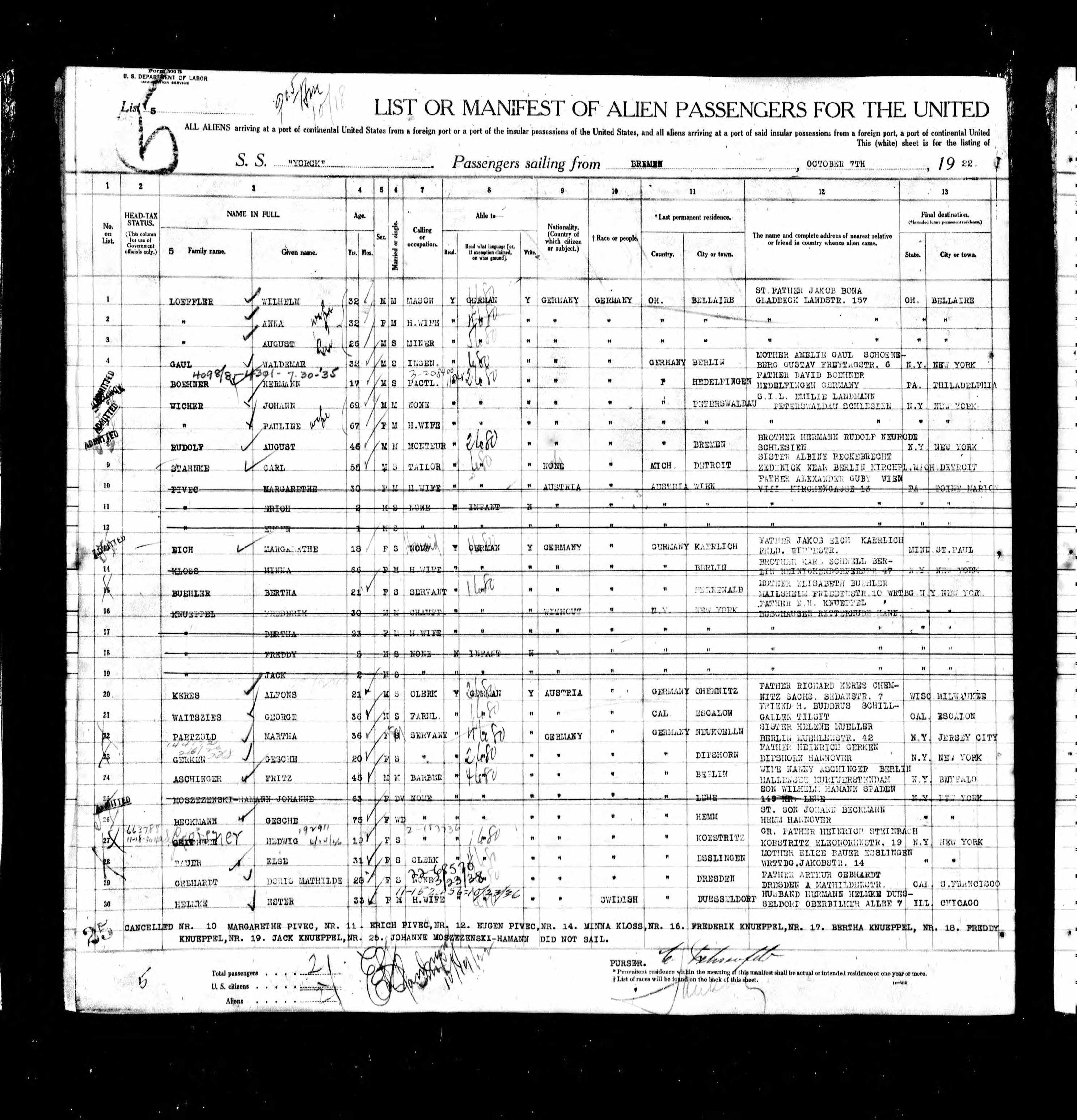 Geplant, aber annuliert: 07.10.1922 Abfahrt Bremen mit "S.S. Yorck"